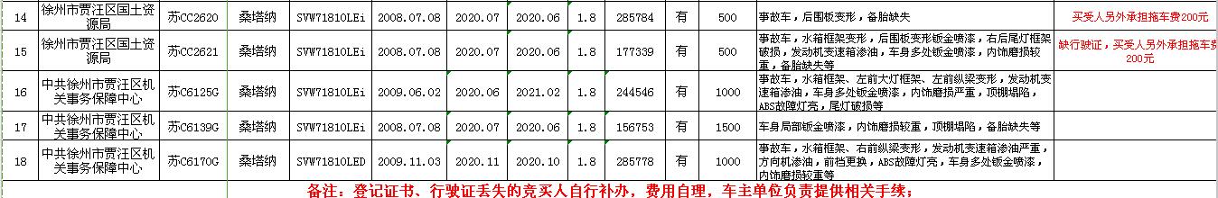 ⑴2008年蘇CC2611桑塔納;⑵2008年蘇CC2612桑塔納;⑶2008年蘇CC2613桑塔納;⑷2008年蘇CC2614桑塔納;⑸2008年蘇CC2615桑塔納;⑹2008年蘇CC2616桑塔納;⑺2008年蘇CC2617桑塔納;⑻2008年蘇CC2618桑塔納;⑼2008年蘇CC2619桑塔納;⑽2008年蘇CC2620桑塔納;⑾2008年蘇C6139G桑塔納;⑿2009年蘇C6170G桑塔納;⒀2009年蘇C6125G桑塔納;⒁2013年蘇C89085長安之星;⒂2013年蘇C89901長安之星;⒃2012年蘇C82808帕薩特;⒄2013年蘇CC6162江淮;⒅2007年蘇C5896G帕薩特。