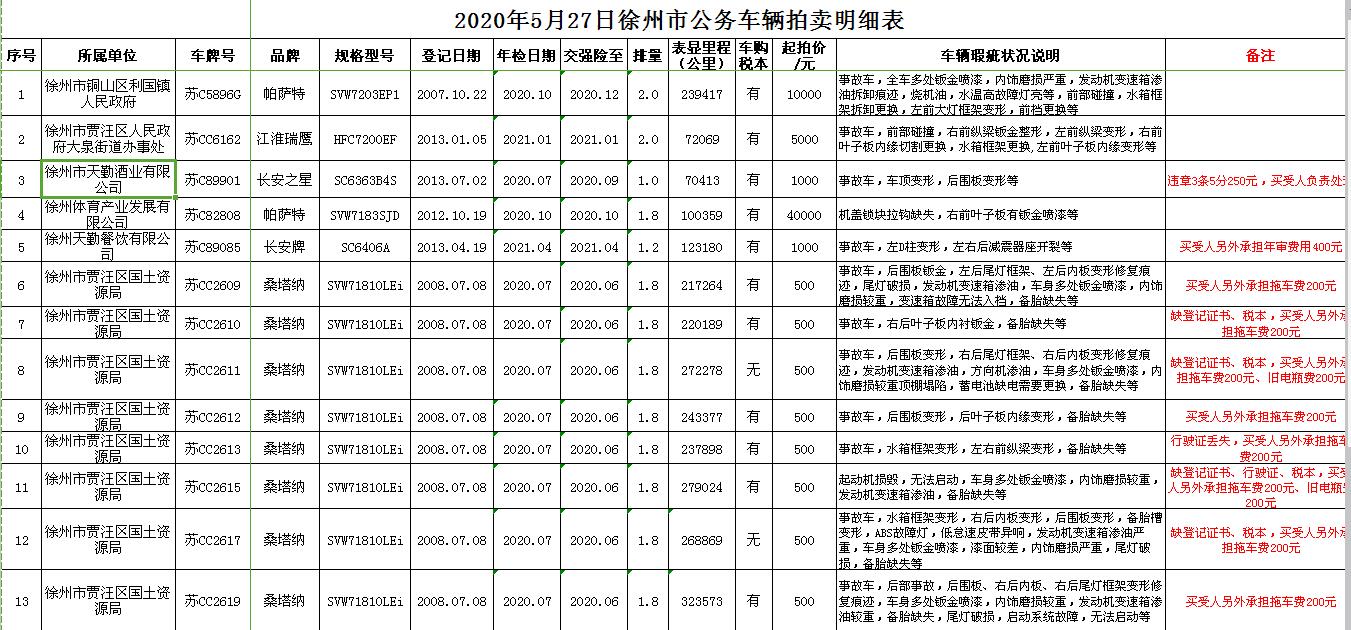 關(guān)注微信公眾號受委托,我公司定于2020年5月27日13:00時在徐州市銀地二手車交易市場四樓東南拍賣大廳通過現(xiàn)場和汽車街網(wǎng)絡(luò)拍賣平臺同步進(jìn)行的方式公開拍賣以下公務(wù)車輛: