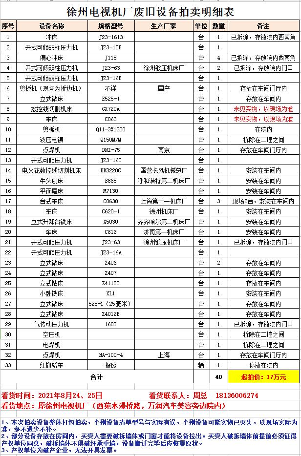 1、徐州電視機廠廢舊設備一批。包含:沖床、壓力機、折邊機、鉆床、機床、車床、刨床、磨床、銑床等、空壓機、電焊機等。(競買人須為具有再生資源回收資質(zhì)的企業(yè)法人),拍賣參考價17萬元。保證金5萬元。