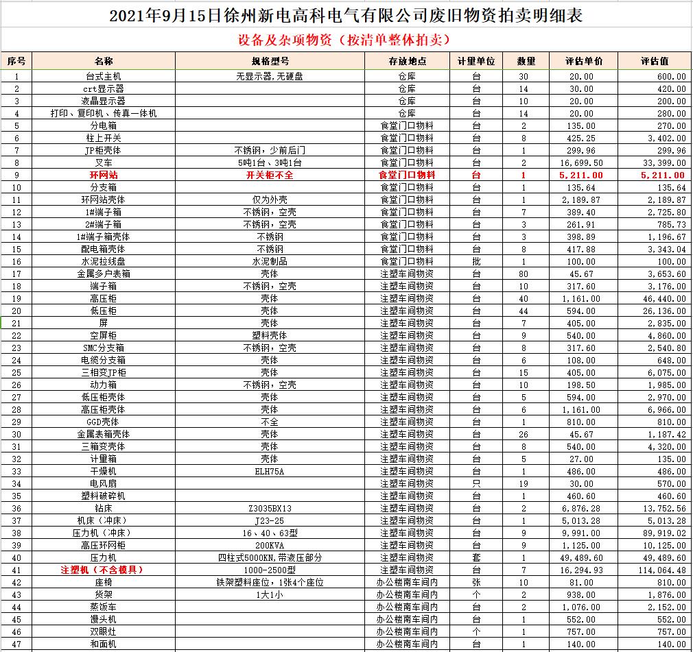 9月14、15日在徐州新電高科電氣有限公司集中展示。符合條件者請(qǐng)持上述資質(zhì)原件及公章等到本公司辦理報(bào)名,并交納10萬元保證金即可參拍,報(bào)名截止至9月13日16時(shí)。